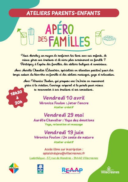 Un apéro des familles est proposé une fois par mois sur la Ludothèque, le vendredi de 18h30 à 20h. Cet atelier est animé en alternance par Aurélie Chevalier, éducatrice et formatrice en éducation positive et gestion des émotions, et par Véronica Foulon, qui proposera une (re)mise en mouvement grâce à la création, l'ancrage corporel et la parole pour mieux se reconnecter à ses émotions et ses sensations