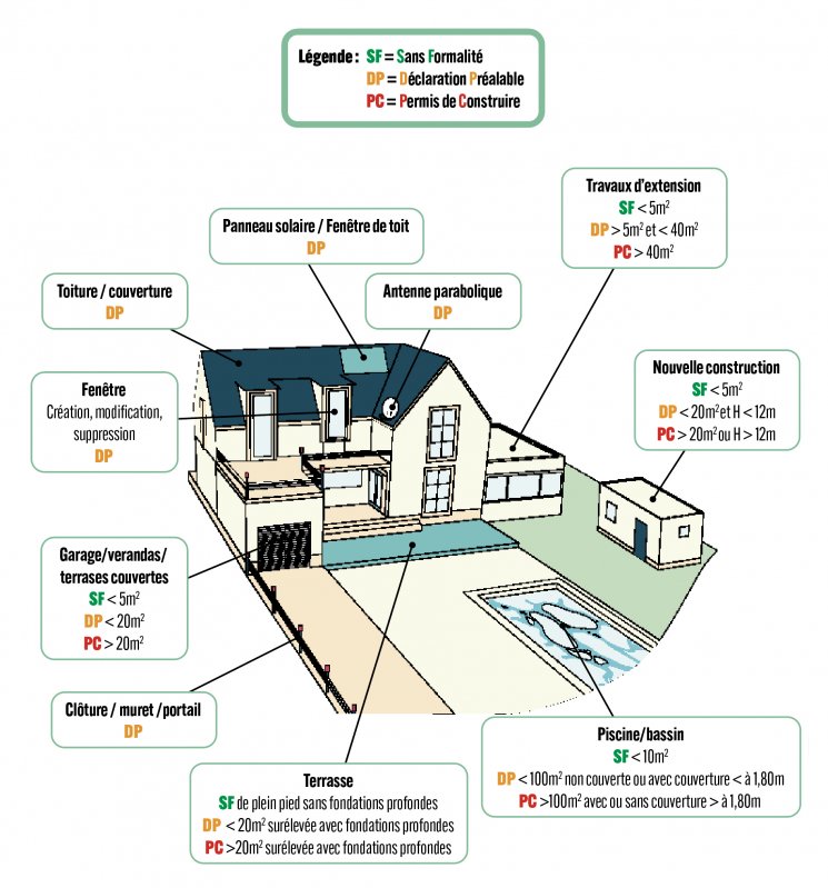 Selon la nature des travaux, il faut demander un permis de construire ou d'aménager, une déclaration préalable de travaux, une autorisation d'aménager un établissement recevant du public…