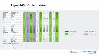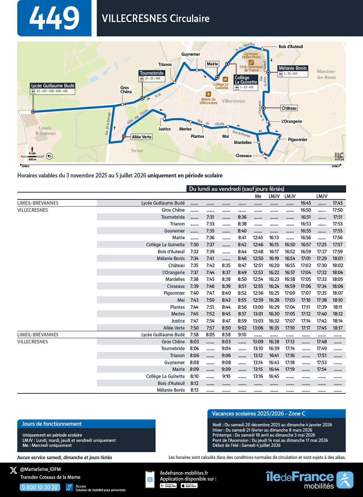 Consultez les horaires ici - 449 : C'est une ligne interne à Villecresnes, qui relie le collège La Guinette à l'allée Verte en faisant un tour de ville. Circule en semaine, uniquement durant la période scolaire. Ces derniers mois, la Municipalité a oeuvré pour que le circuit et les horaires soient adaptés à la dépose et à la reprise des écoliers et collégiens villecresnois.