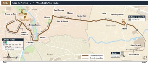 Deux arrêts desservent Villecresnes. - 4111 : Relie la gare RER de Boussy-Saint-Antoine à Épinay-sous-Sénart en passant par Mandres-les- Roses, Villecresnes (arrêt Henri Dunant) et Brunoy. Elle fonctionne 7 jours sur 7.